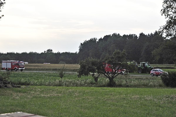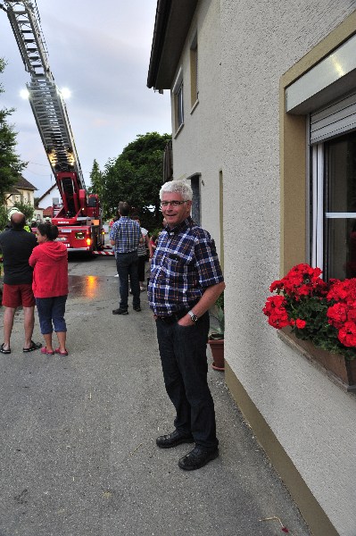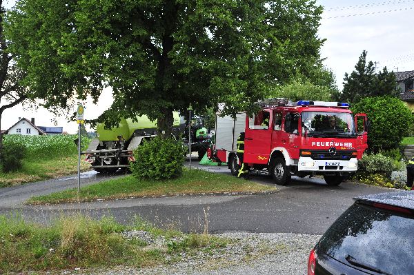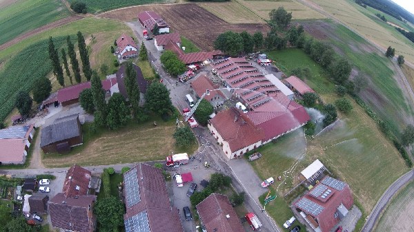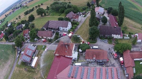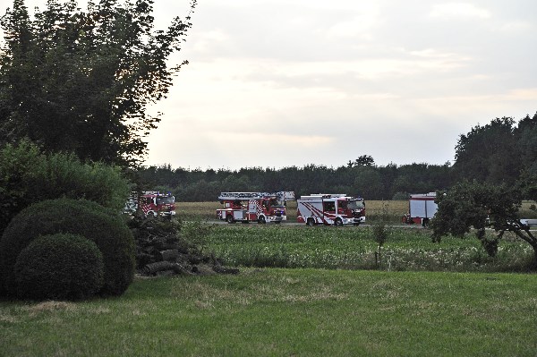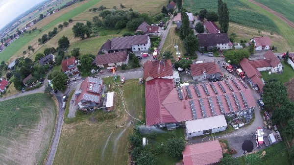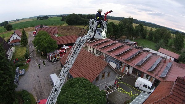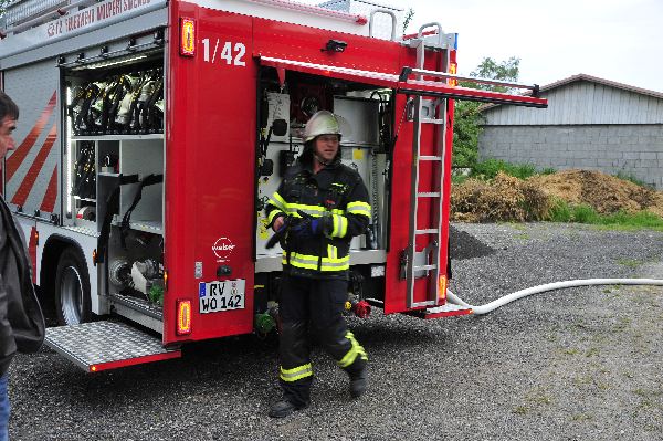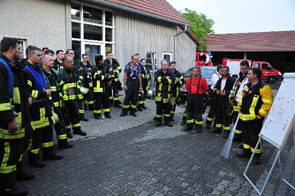 Die anderen Übungskräfte bekamen die Aufgabe die benachbarten Gebäude, sowie ein Gastank, vor dem Feuer und der Strahlungshitze zu schützen. Da die Löschwasserversorgung für solch einen „Einsatz“ zu gering war, wurde mittels Wasserfässer der benachbarten Landwirte Löschwasser zum Übungsobjekt gefahren, so dass ein Übergreifen des Feuers verhindert werden konnte.