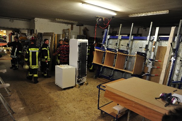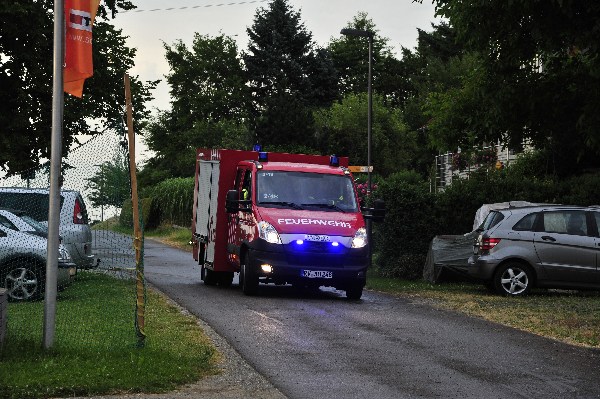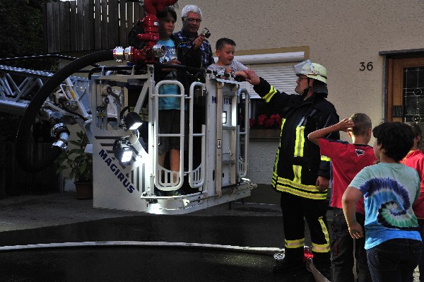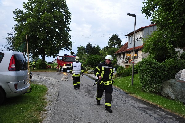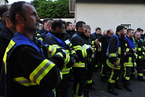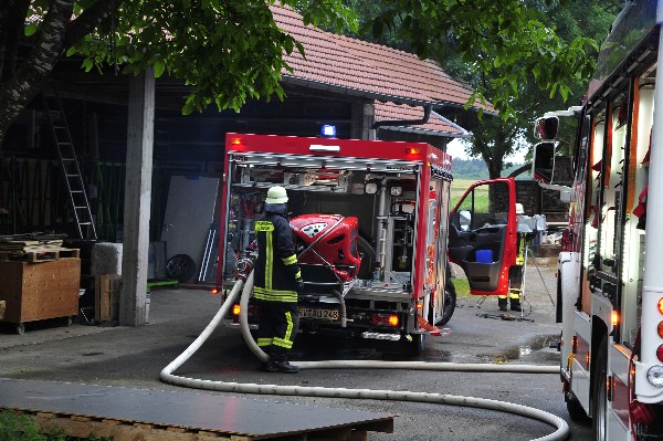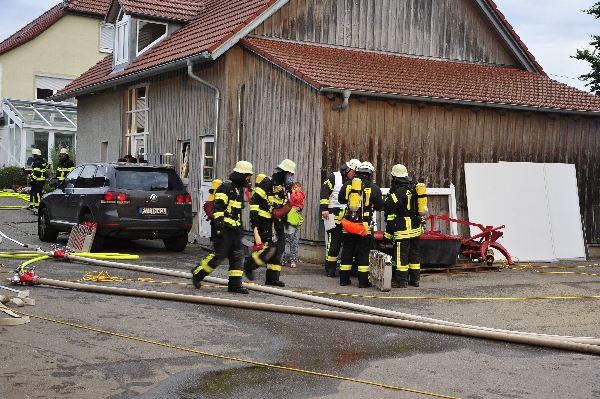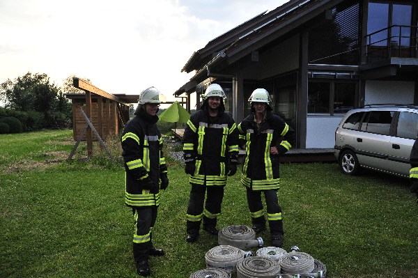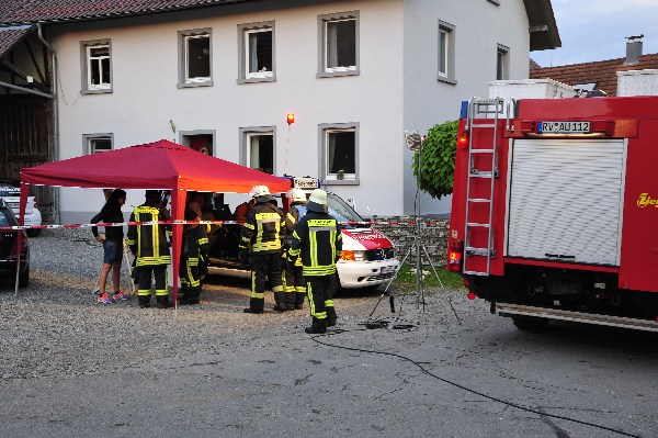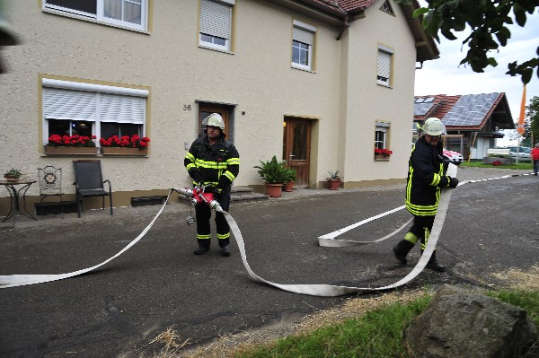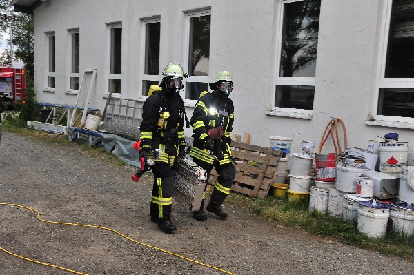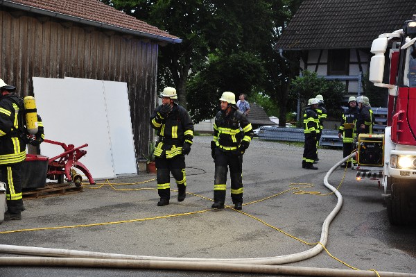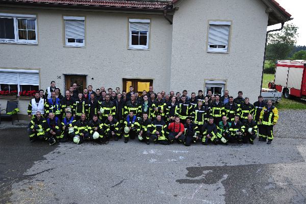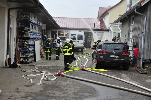 Die nach wenigen Minuten eintreffenden Rettungskräfte bekamen von Übungsleiter Kommandant Markus Huchler den Befehl die vermissten Personen im Gebäude zu retten und das Feuer im Innern der Werkstatträume zu bekämpfen.Aufgrund der „Verrauchung“ im Gebäude war dies eine schwierige Aufgabe. Dennoch wurden die „verletzten Personen“ innerhalb kürzester Zeit von den Trupps im Innenangriff gefunden. Aufgrund des schwülen Wetters und dem Tragen der Atemschutzgeräte war dies eine sehr anstrengende Schweißtreibende Tätigkeit.